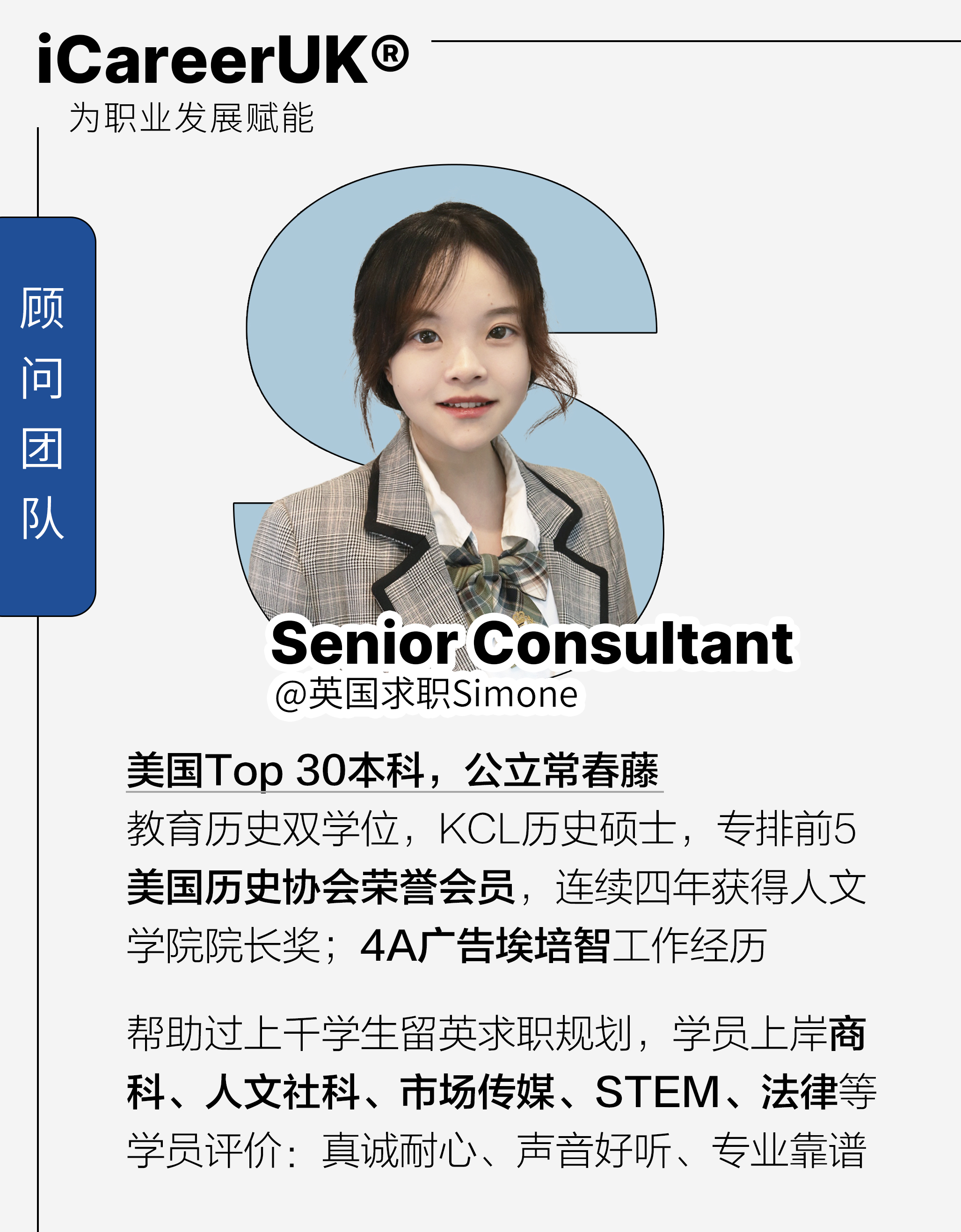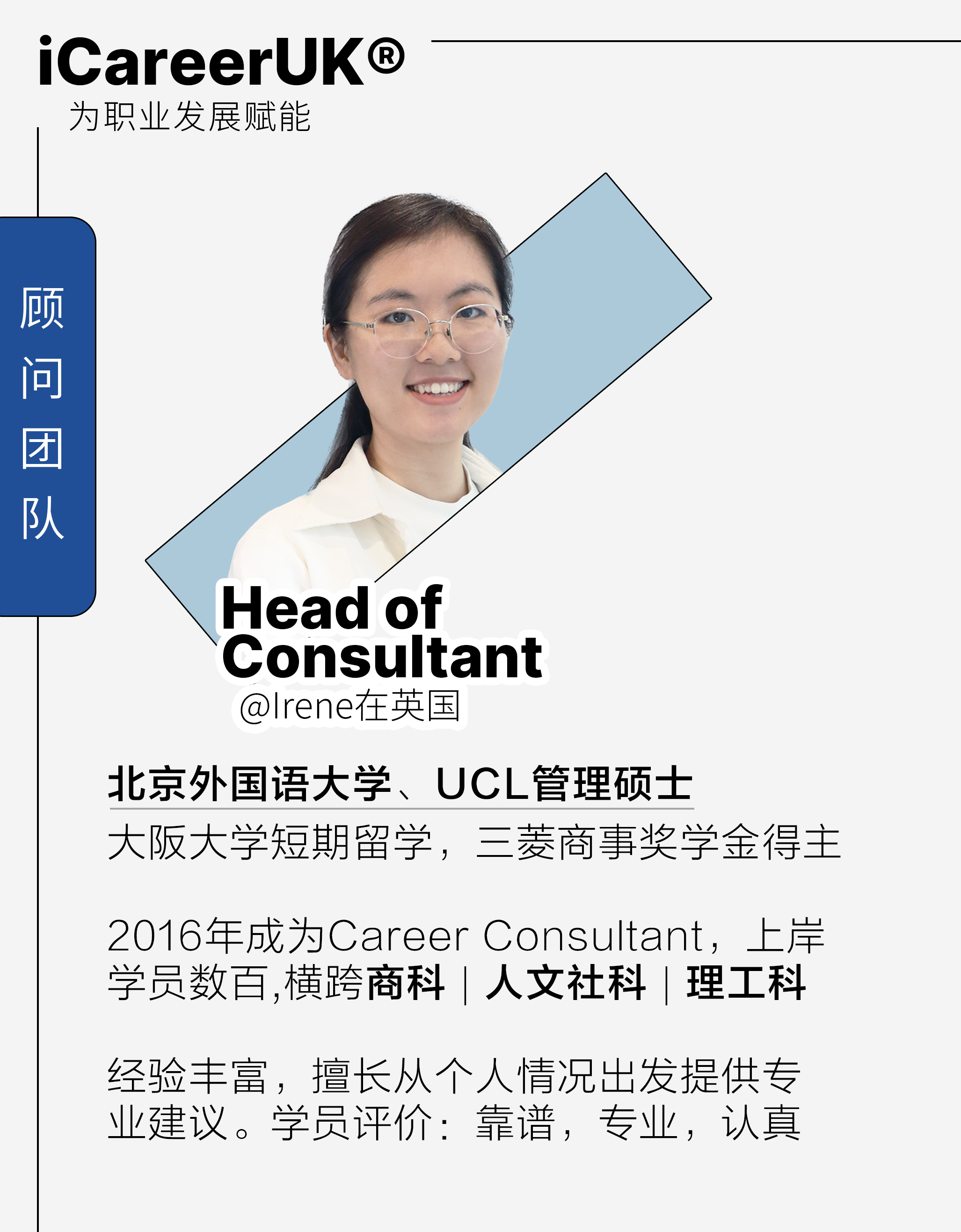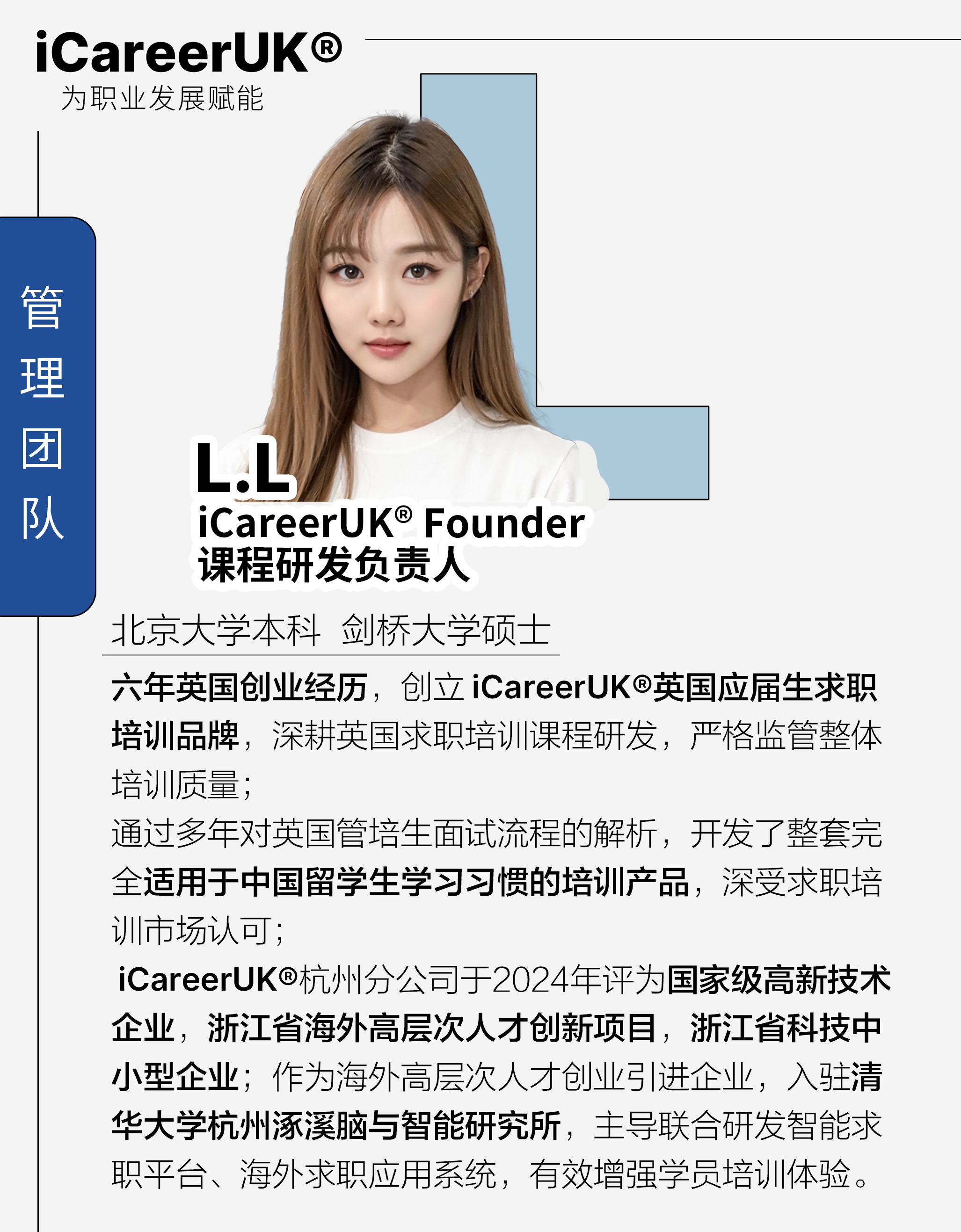 6年英国创业经历,创立iCareerUK®英国应届生求职培训品牌,深耕英国求职培训课程研发,严格监管整体培训质量。通过多年对英国管培生面试流程的解析,开发了整套完全适用于中国留学生学习习惯的培训产品,深受求职培训市场认可。