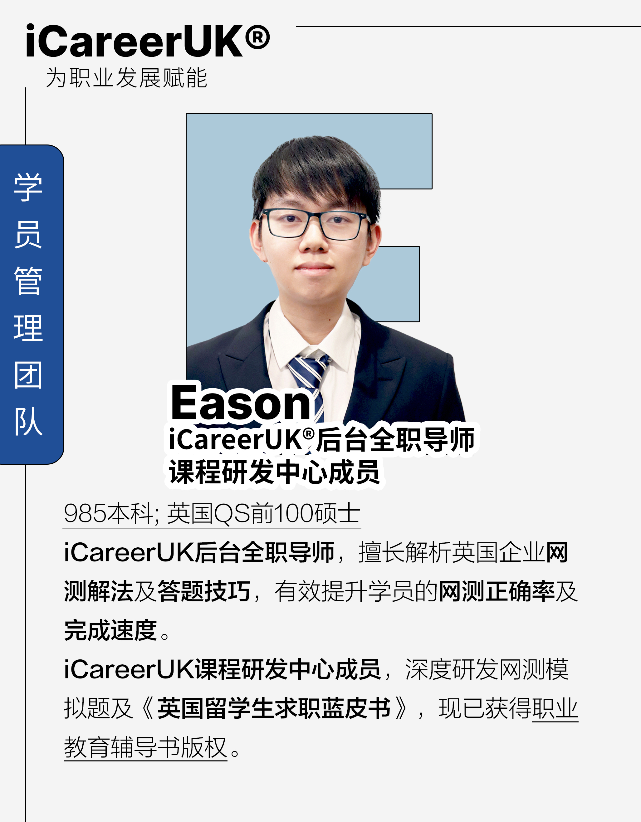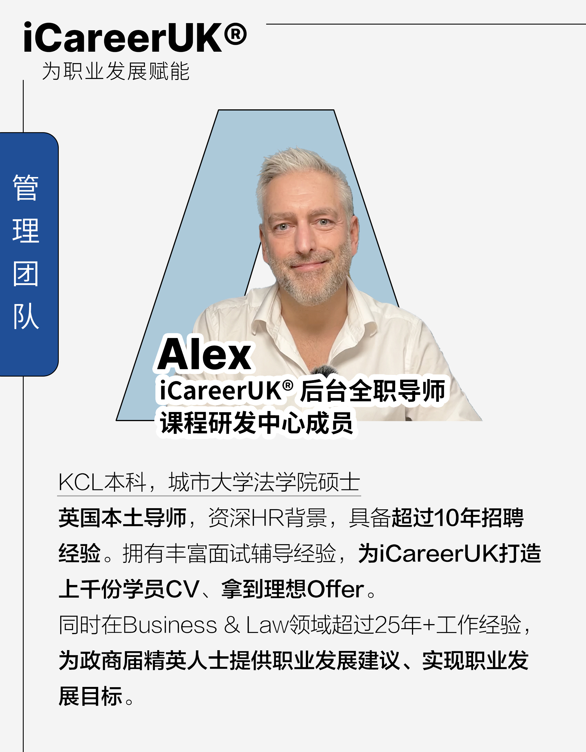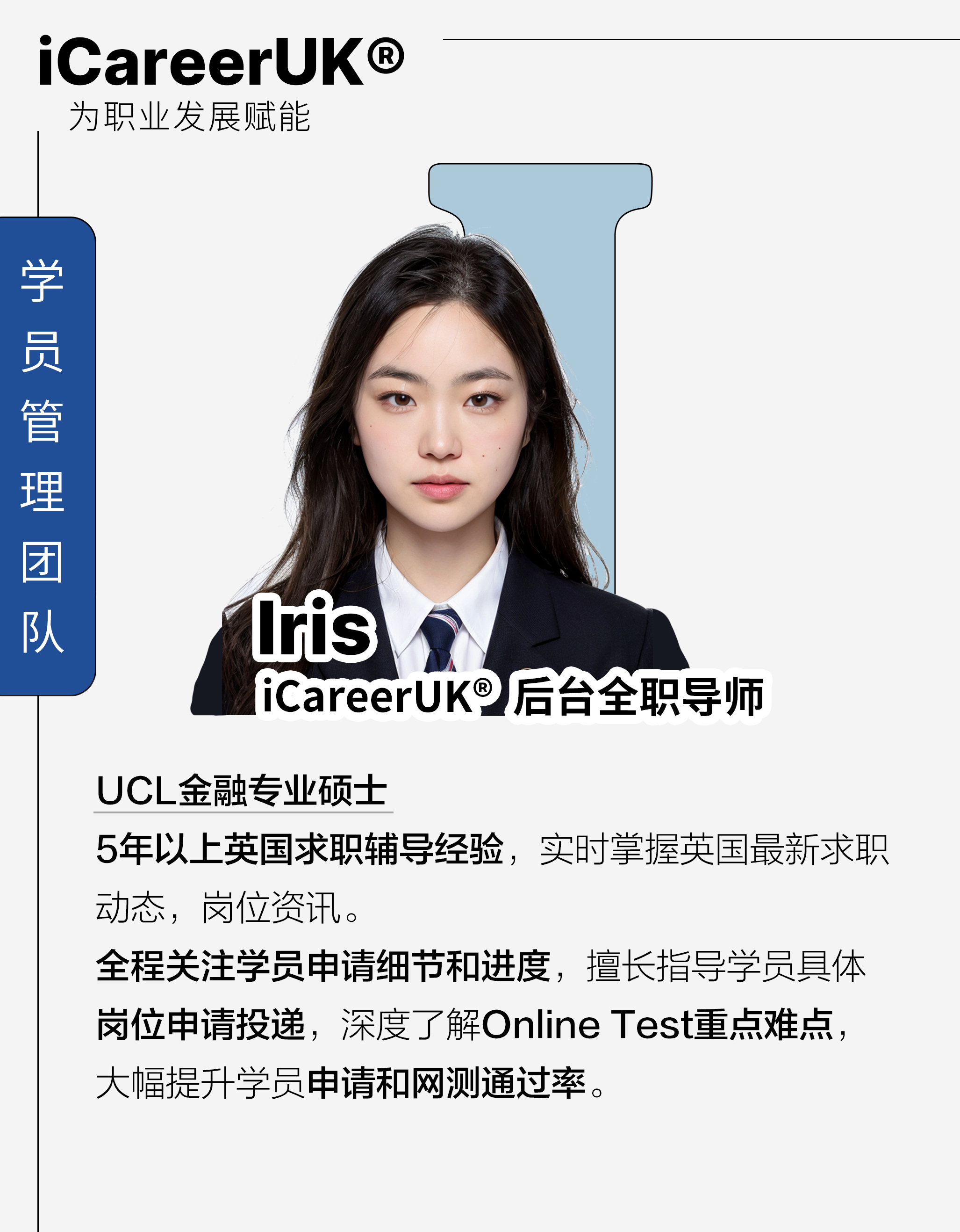 6年英国创业经历,创立iCareerUK®英国应届生求职培训品牌,深耕英国求职培训课程研发,严格监管整体培训质量。通过多年对英国管培生面试流程的解析,开发了整套完全适用于中国留学生学习习惯的培训产品,深受求职培训市场认可。